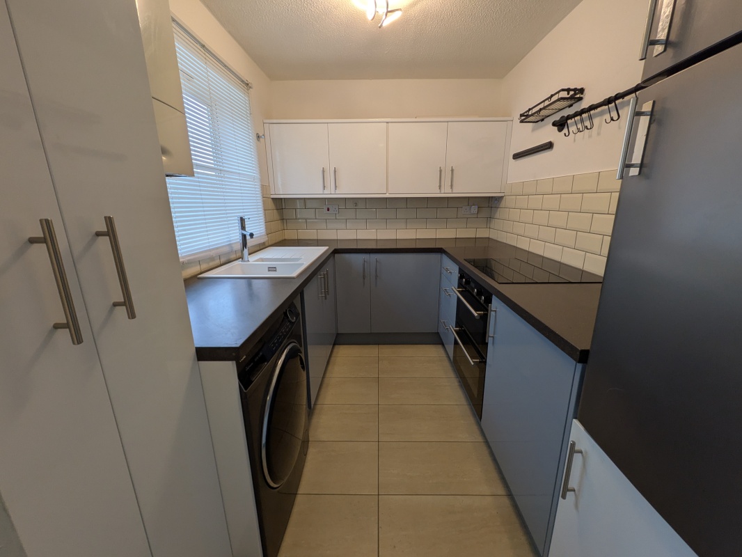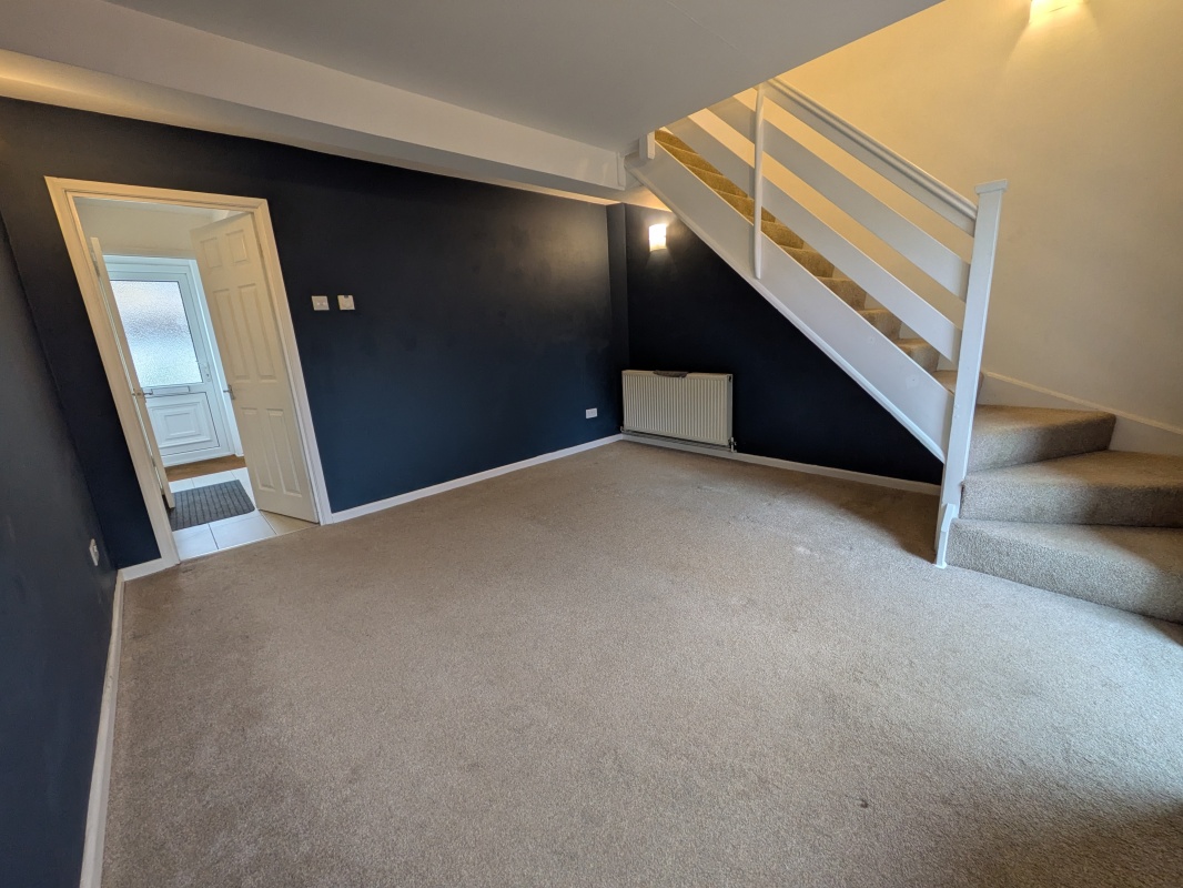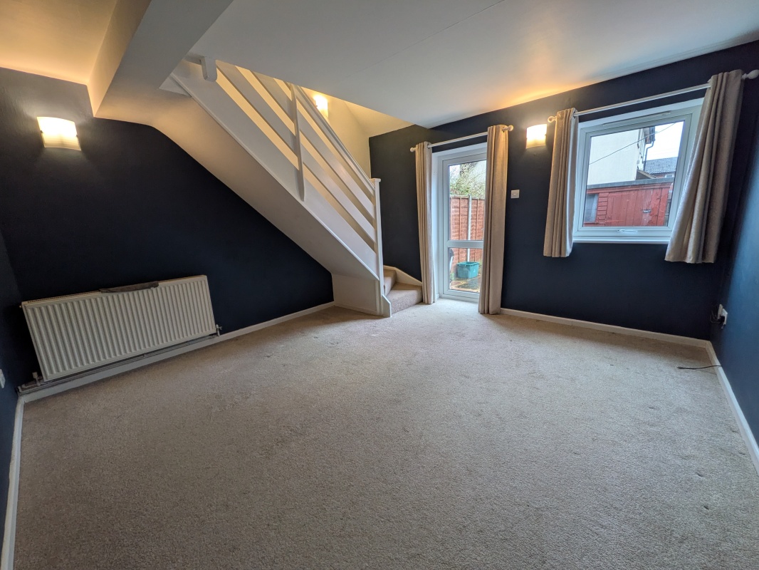 The house consists of a living room and modern kitchen on the ground floor, with two bedrooms and bathroom upstairs.